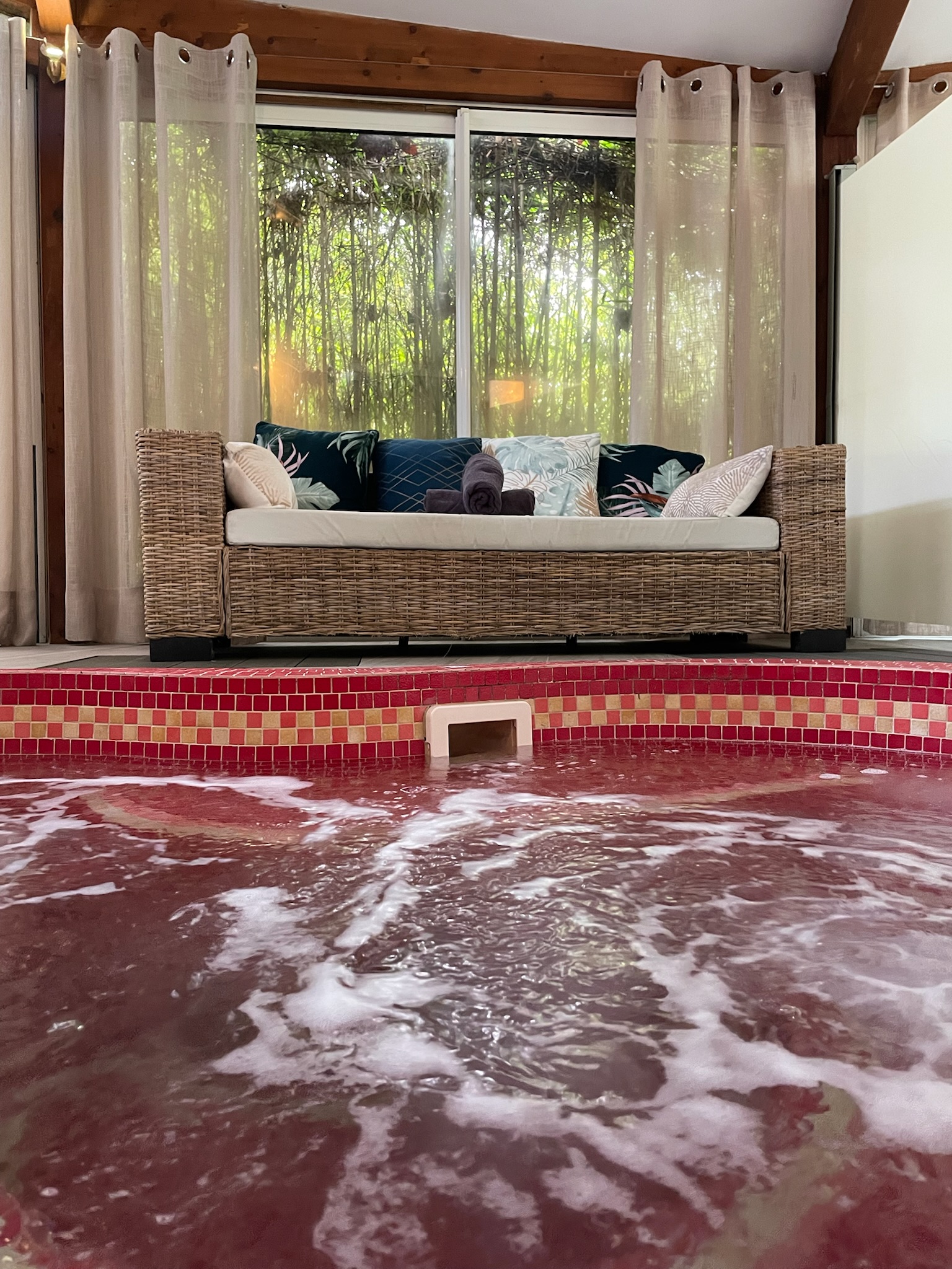 L’eau qui est maintenue à une température constante d’environ 38° et en bouillonnement continu n’est pas vidée mais filtrée et recyclée.